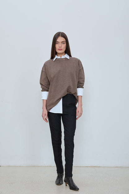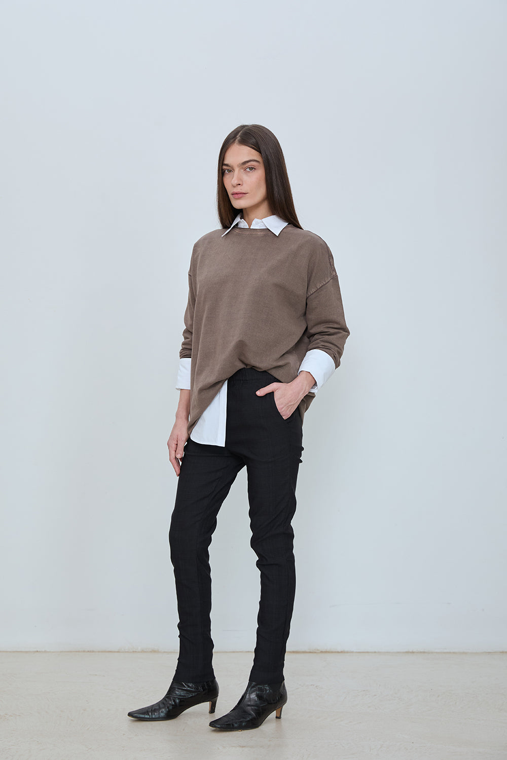 Mid rise slim pant in a soft cotton blend. Clean pull on waistband, straight side pockets, and a tapered leg with a smooth, structured finish. Simple, pull-on silhouette with no zipper or button.