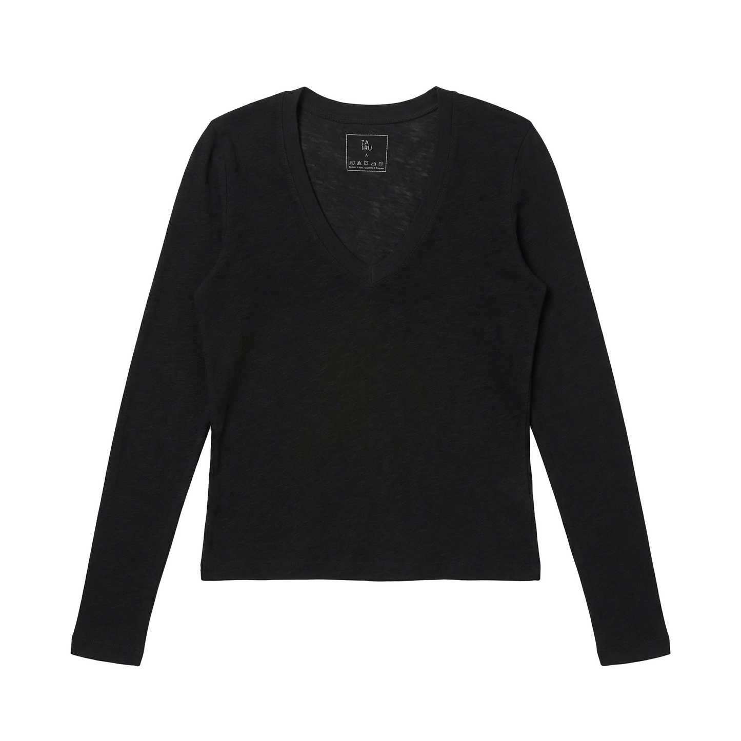 Long sleeve V neck tee in soft cotton jersey. Lightweight feel with a natural slub texture, finished with a clean neckline trim and straight hem. Designed for an easy, everyday fit.
