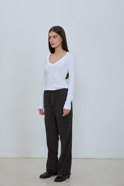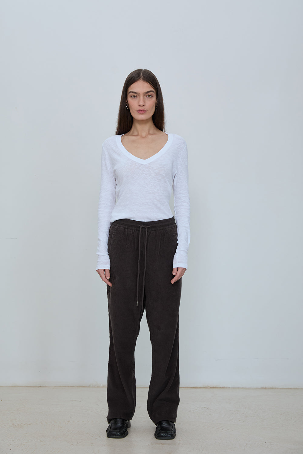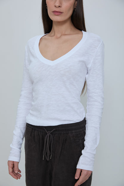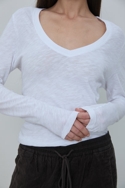 Long sleeve V neck tee in soft cotton jersey. Lightweight feel with a natural slub texture, finished with a clean neckline trim and straight hem. Designed for an easy, everyday fit.