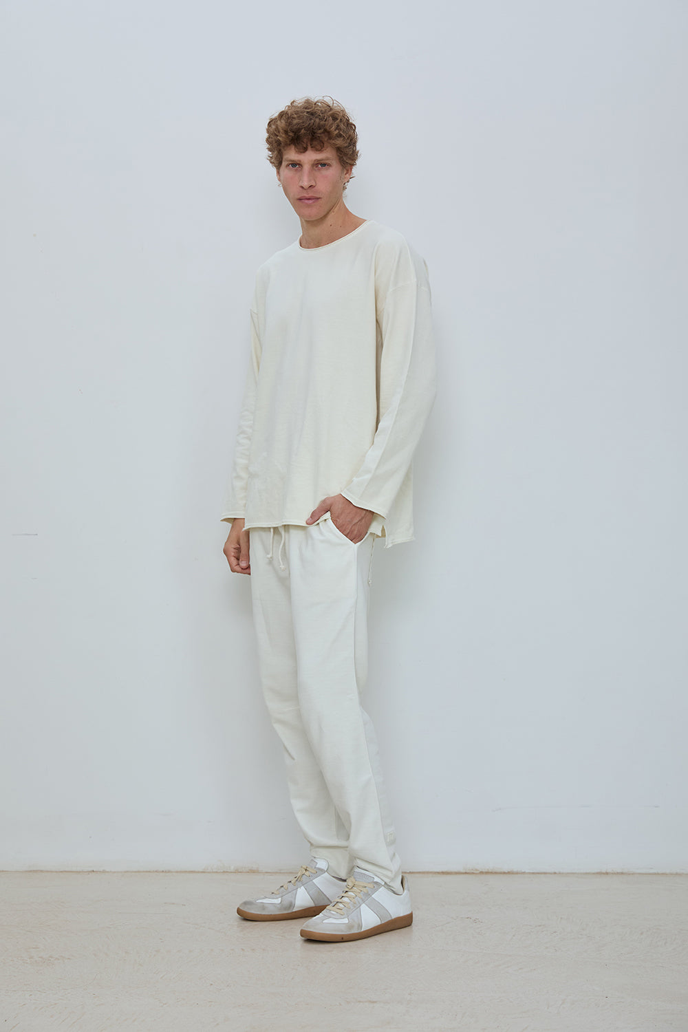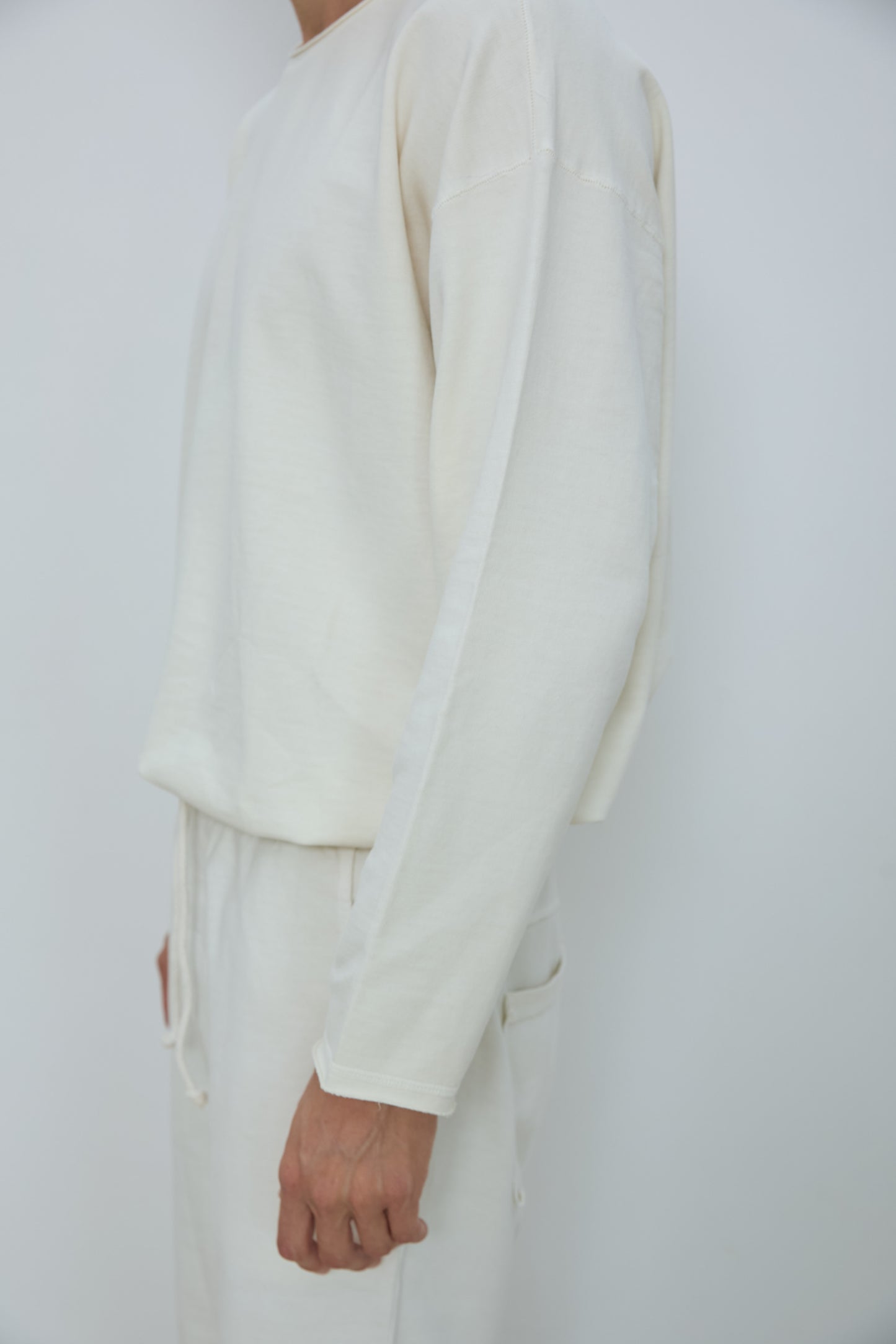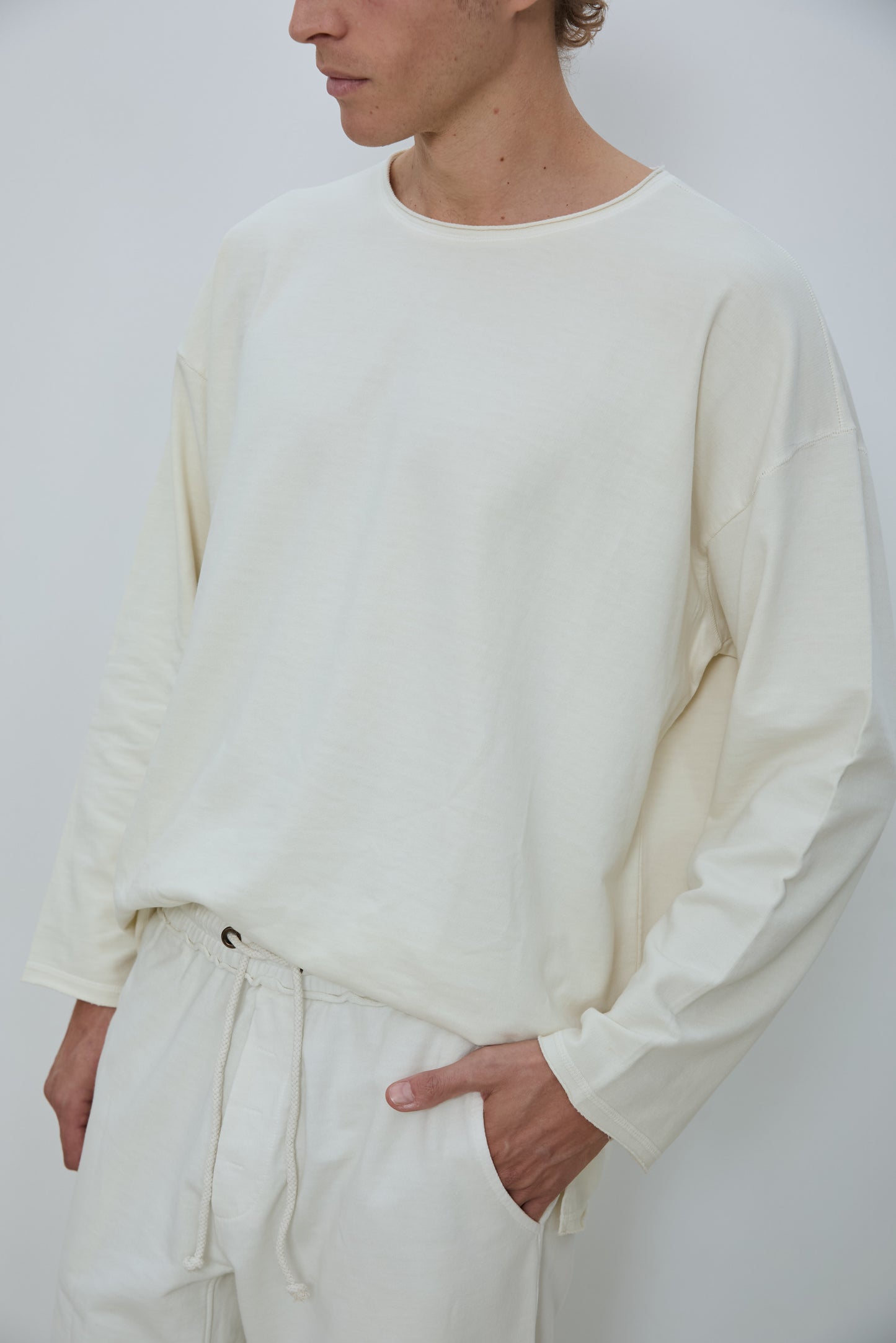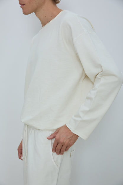 Relaxed crewneck sweatshirt in classic French terry. Soft loopback interior with a natural, lived in texture, finished with raw edge neckline detailing, dropped shoulders, and a straight hem. Designed for an easy, effortless fit.