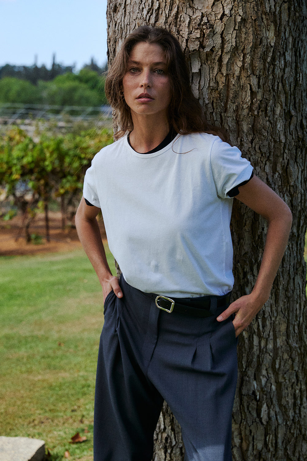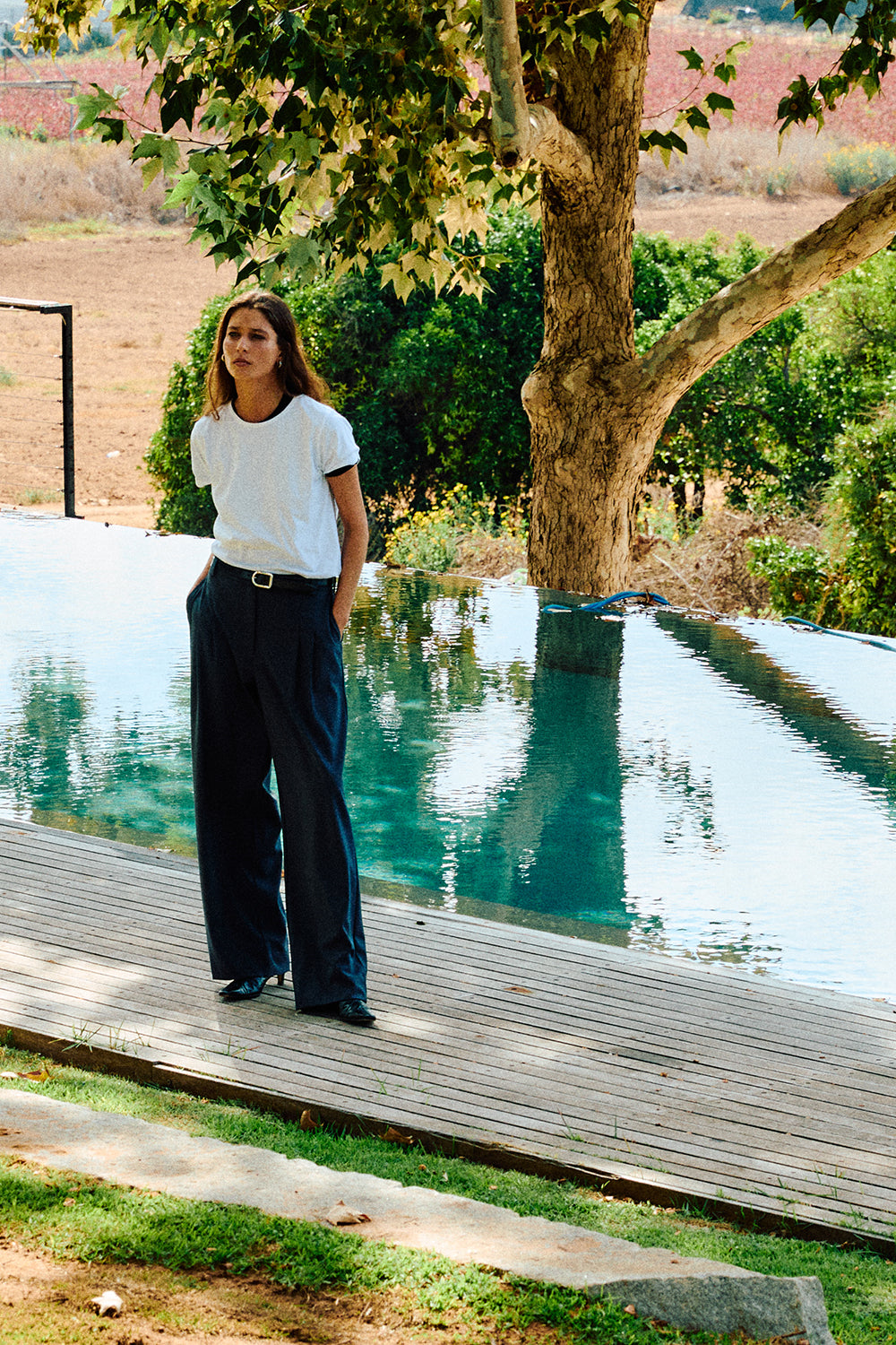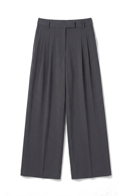 Wide leg trouser with a relaxed, tailored feel. Designed with a flat front, soft pleats, side pockets, and belt loops, with an elasticated back waistband for ease. Finished with a welt back pocket and full length drape.