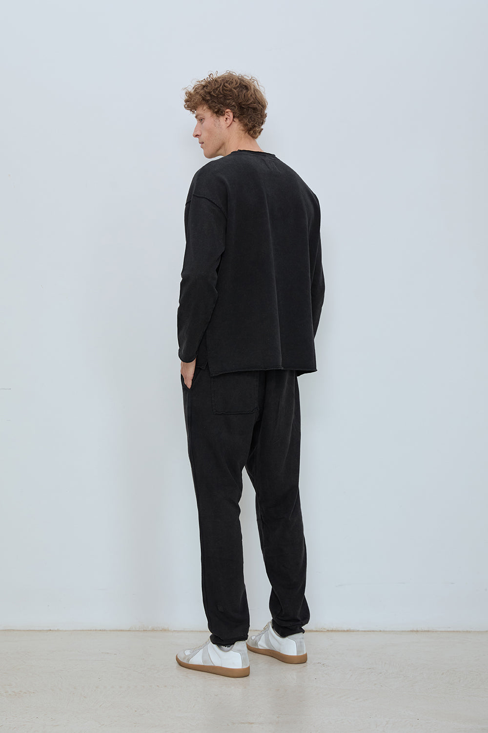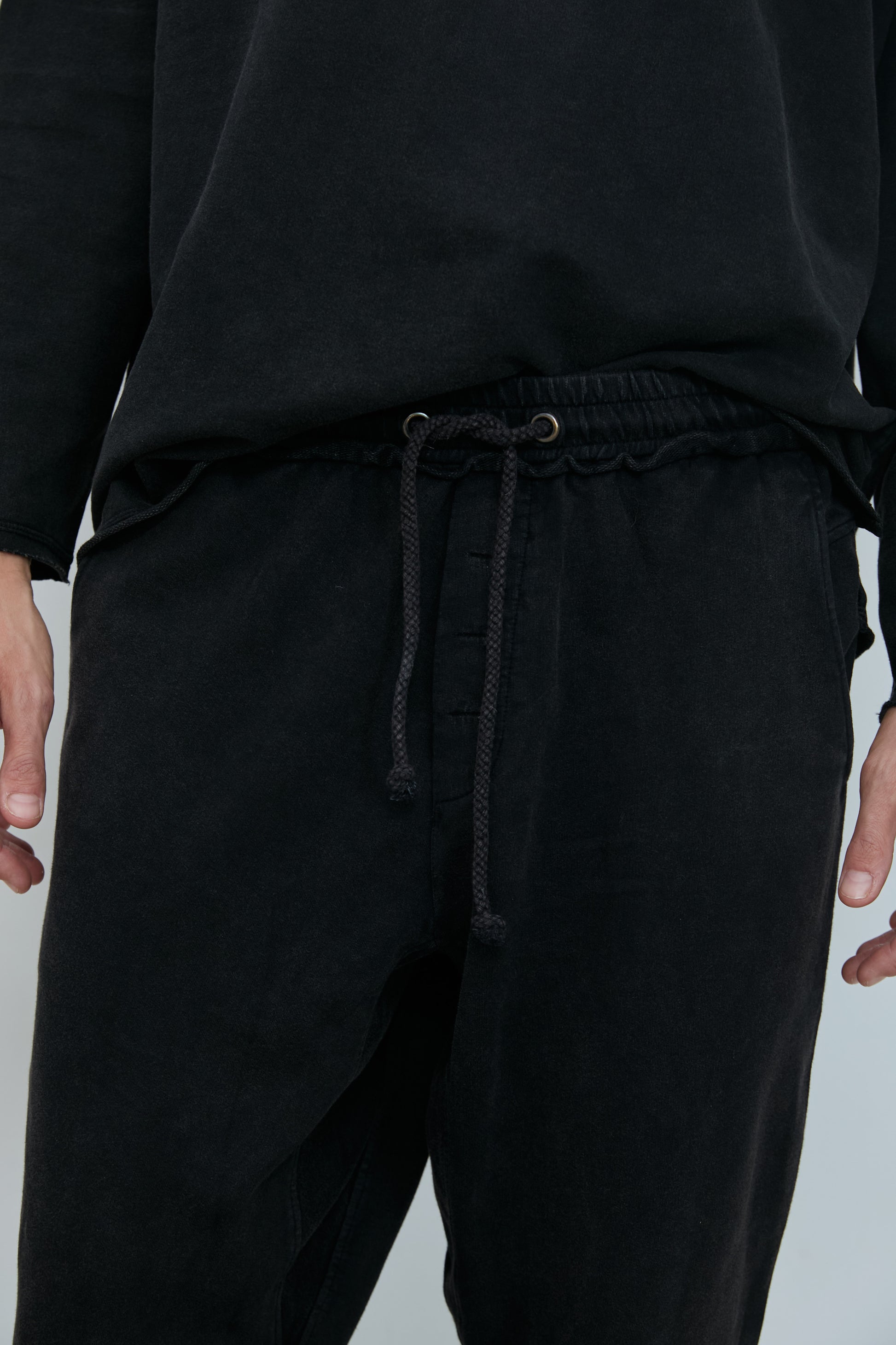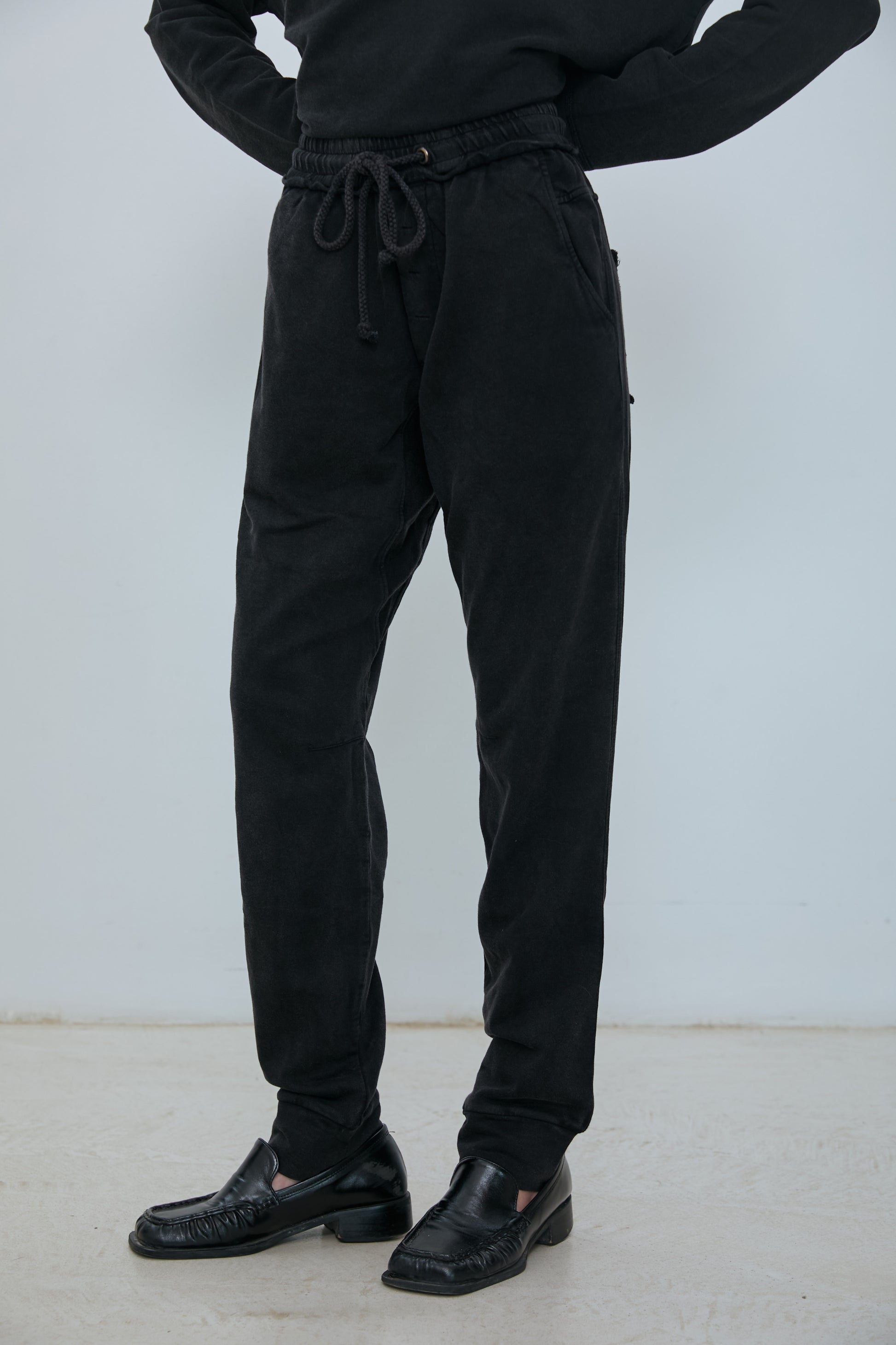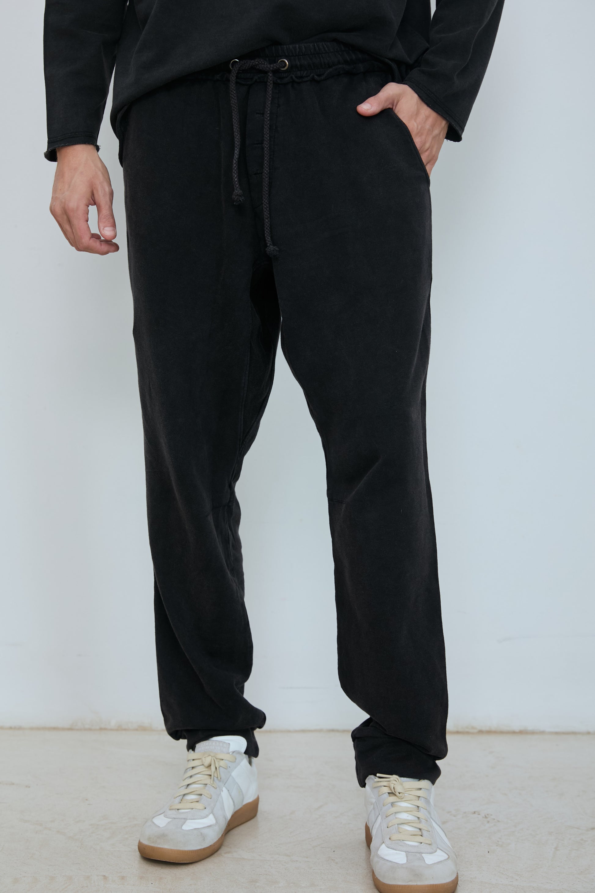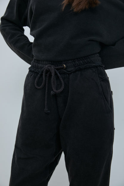 Mid rise sweatpant in classic French terry. Elastic waistband with long braided drawstrings, straight side pockets, and a tapered leg with a soft, relaxed finish. Pull on construction with no zipper or button.