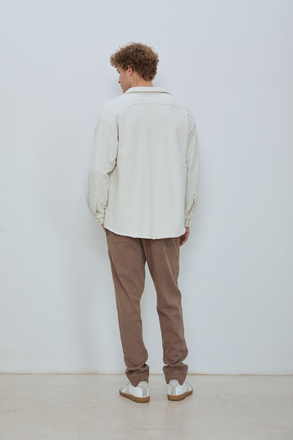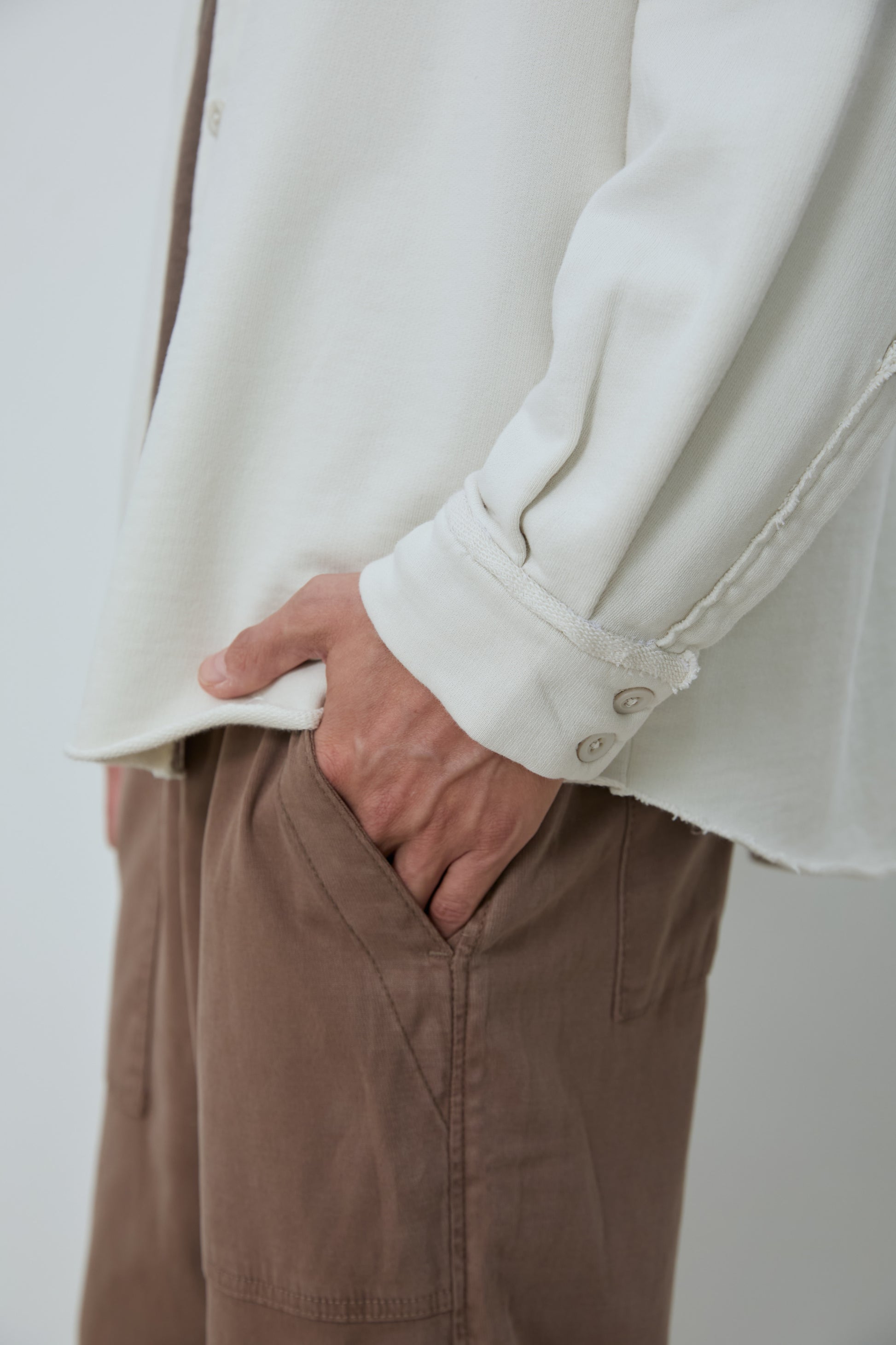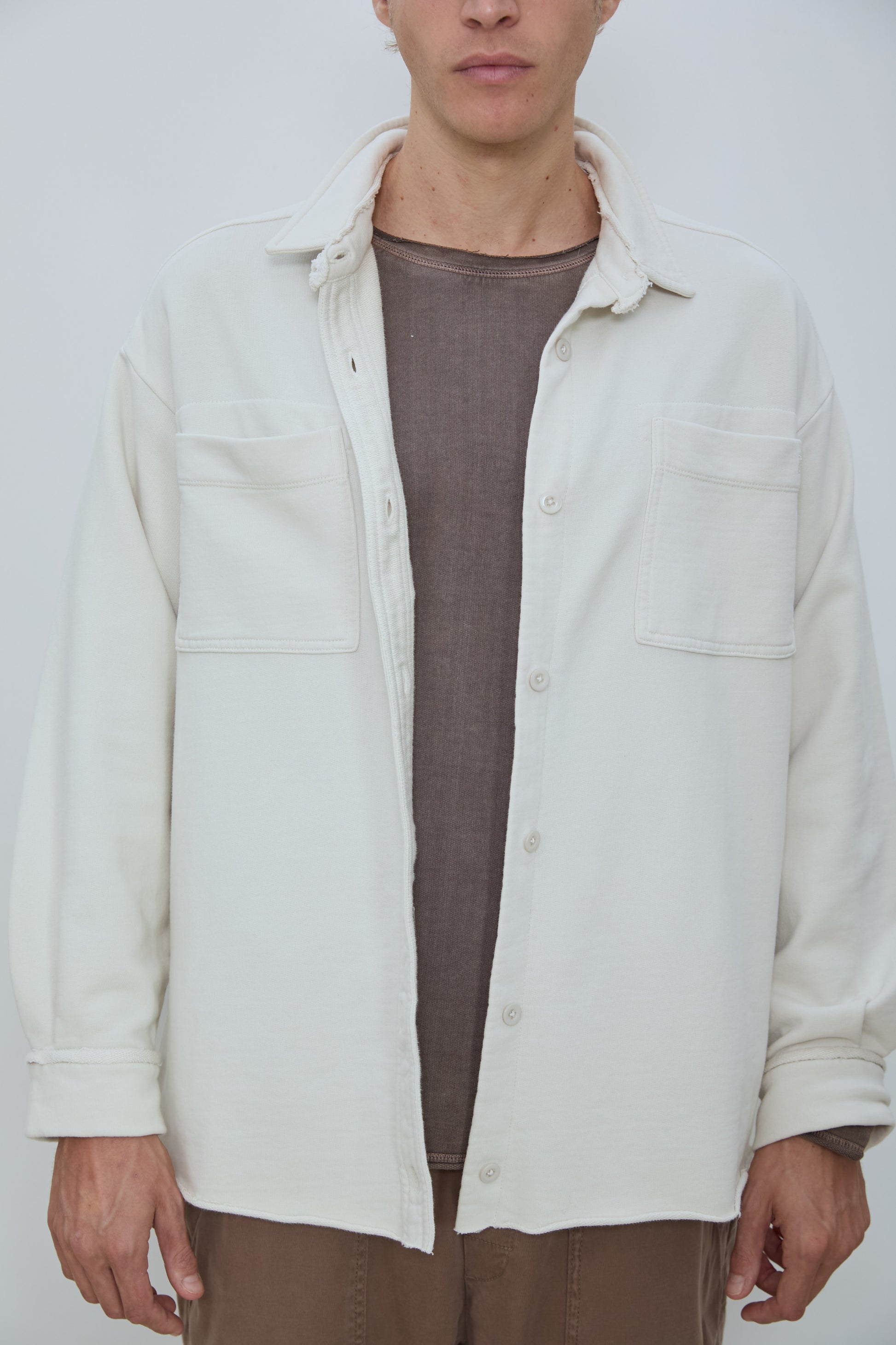 Oversized overshirt in classic French terry. Soft loopback interior with a structured outer surface, finished with a button front, two chest pockets, and raw edge collar detailing. Designed for easy layering with a relaxed, effortless fit.