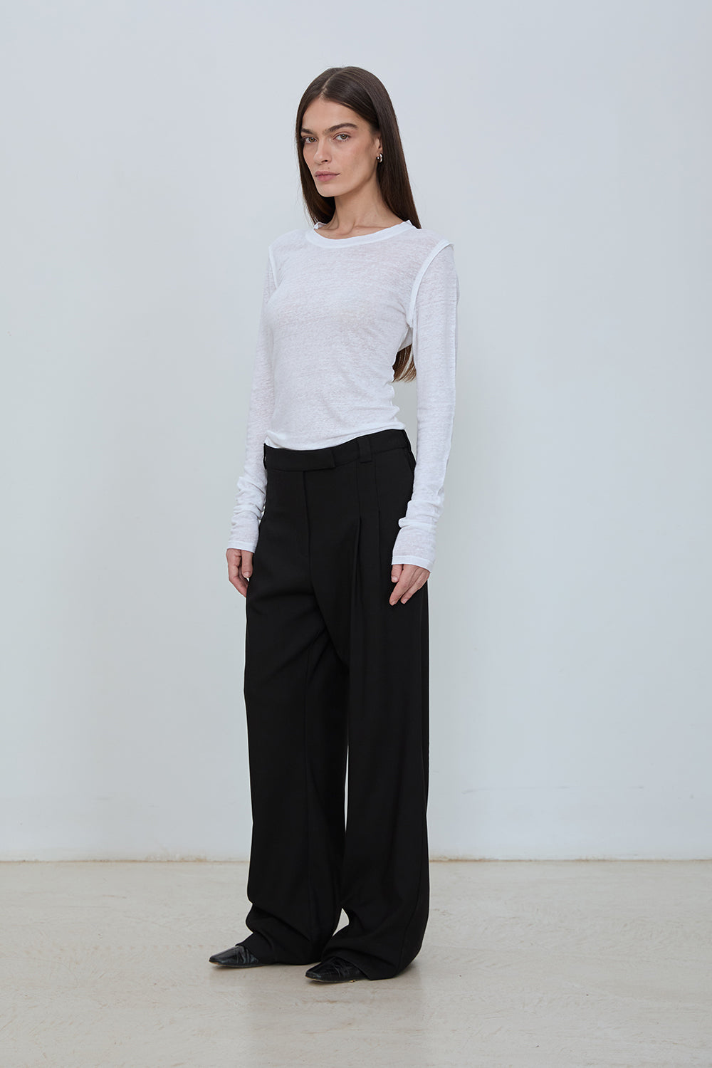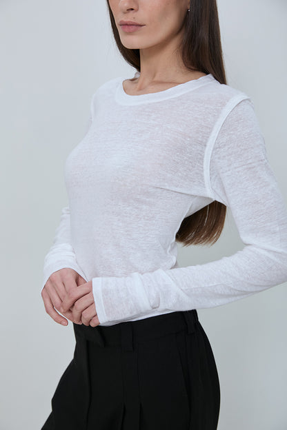 Lightweight long sleeve tee in soft cotton. Designed with a relaxed fit, raw rolled neckline, and extended sleeves with simple cuff finish. The semi sheer slub texture gives it an easy, airy feel perfect for layering.