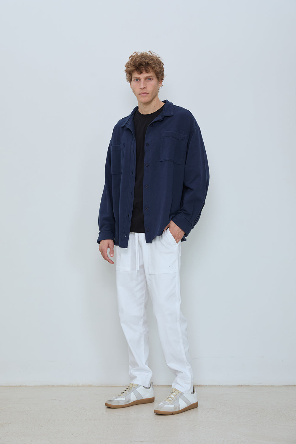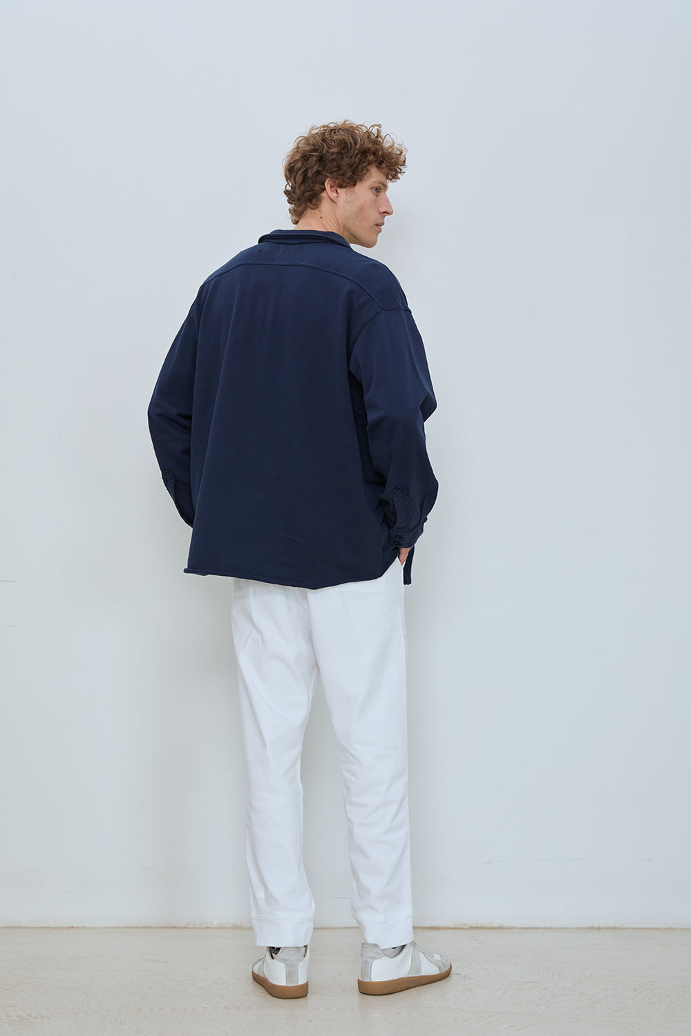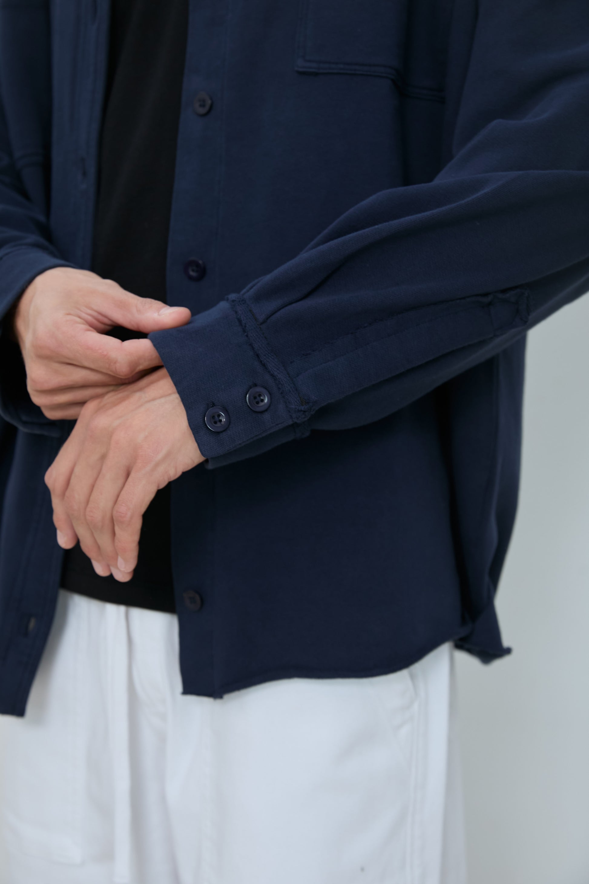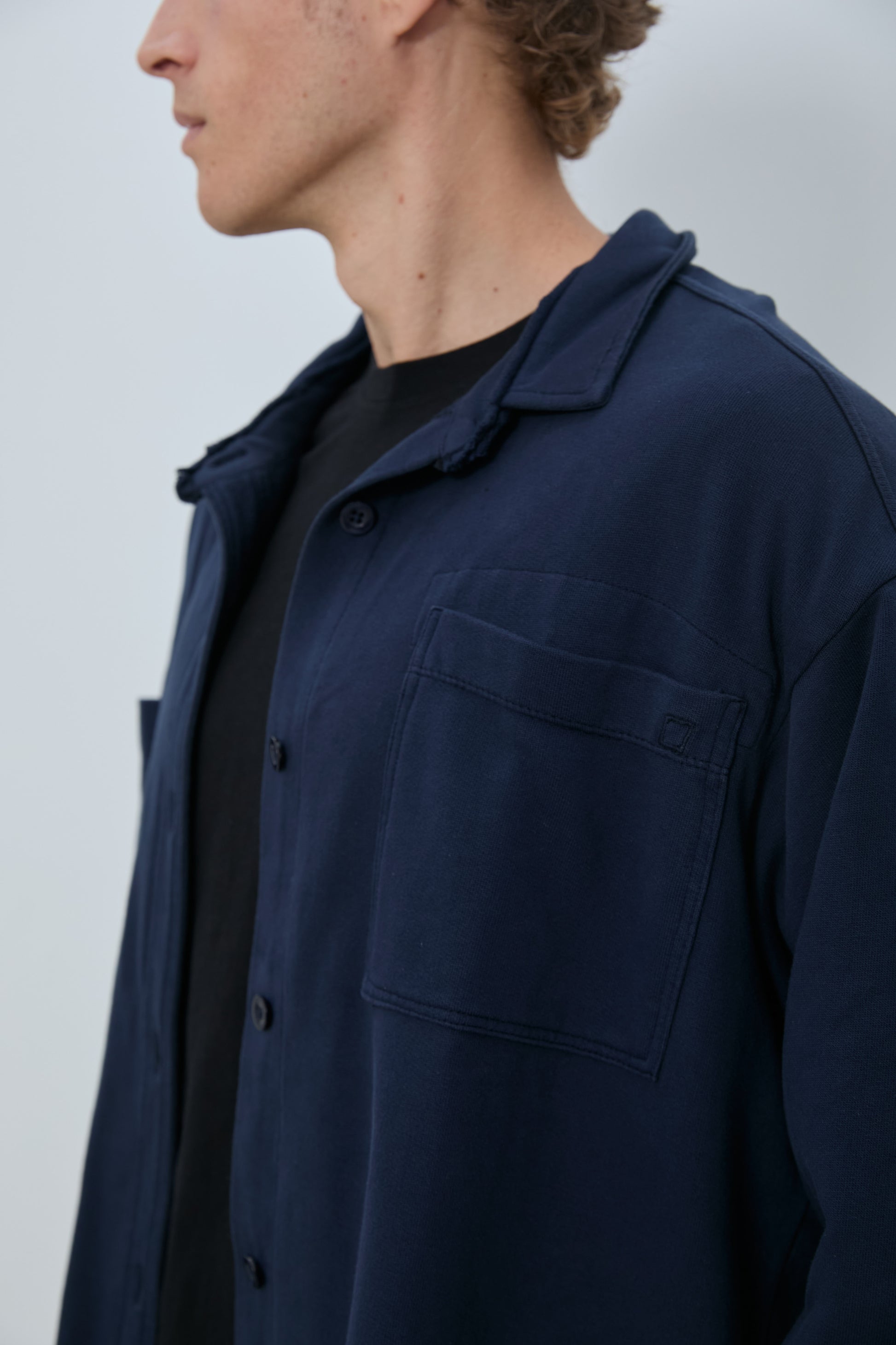 Oversized overshirt in classic French terry. Soft loopback interior with a structured outer surface, finished with a button front, two chest pockets, and raw edge collar detailing. Designed for easy layering with a relaxed, effortless fit.