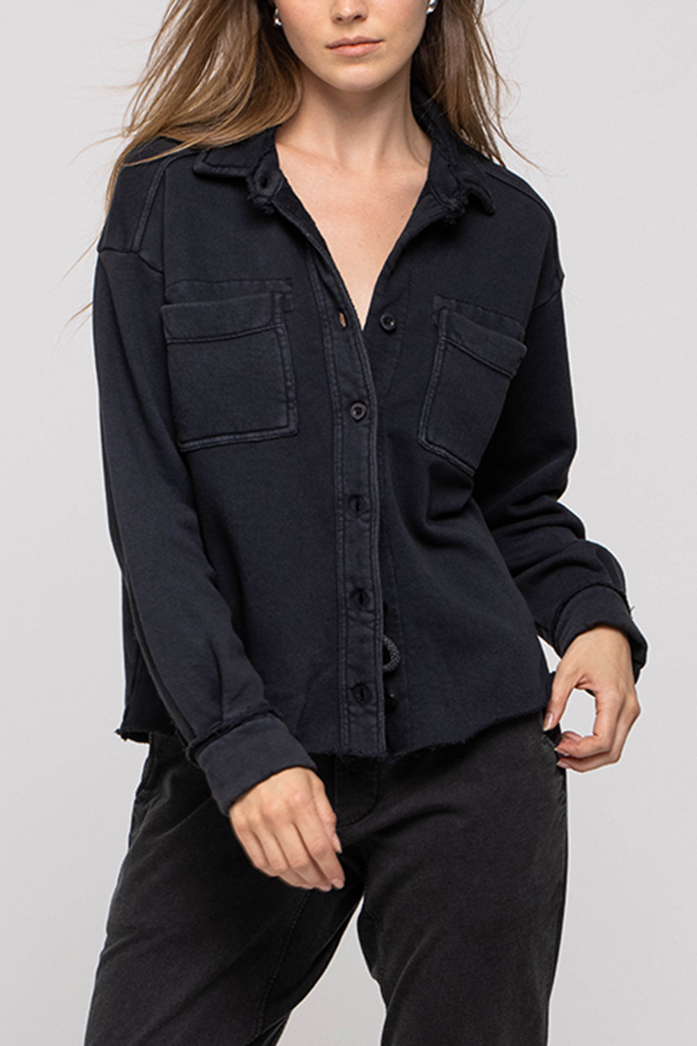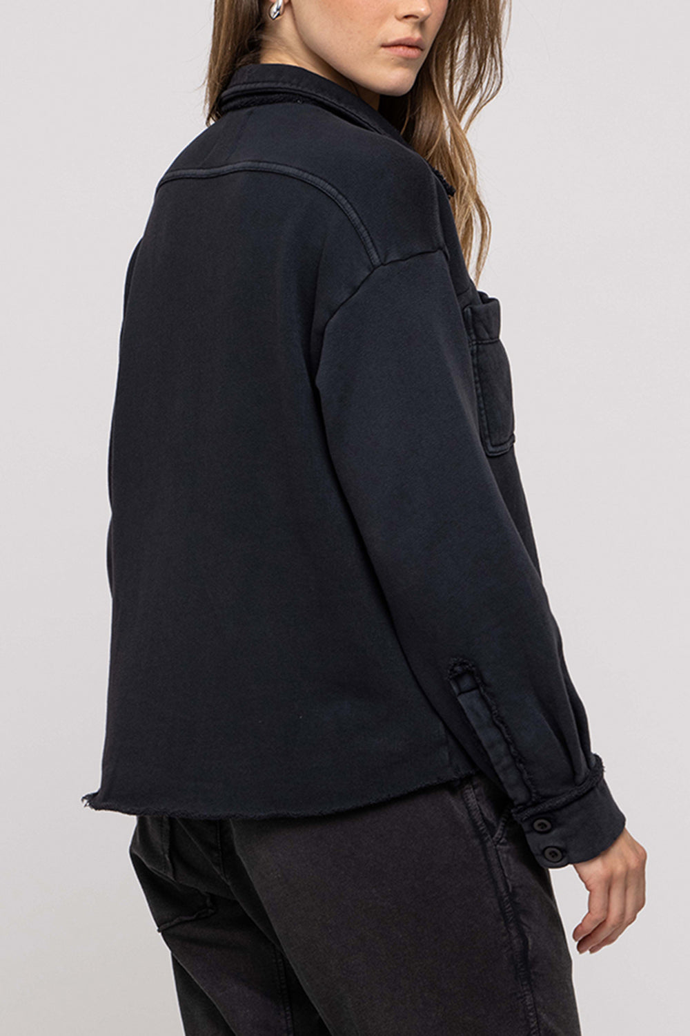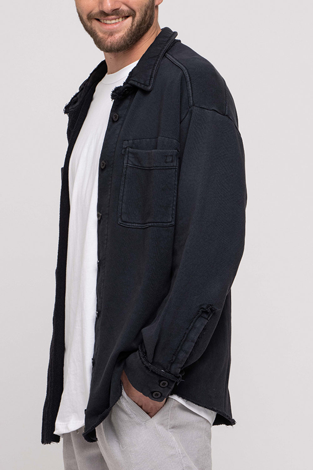 Oversized overshirt in classic French terry. Soft loopback interior with a structured outer surface, finished with a button front, two chest pockets, and raw edge collar detailing. Designed for easy layering with a relaxed, effortless fit.